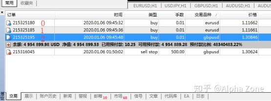 我们再试一下程序的效果。如下图所示,现在有三个订单,两个欧美的单子和一个镑美的单子,按MT4的编号那么两张欧美的单子编号分别是0和1,镑美编号是2,现在从上往下循环平掉欧美的订单。当i=0时,程序选中了一个单子,确实是欧美的单子,平掉了,结果很好,然后再往下走,i变成了1,接下来我们要选中的是编号为1的单子看看是不是欧美的单子。就在这个时候我们发现,由于之前我们选中的0号单子被平掉了,原来的1号单子变成了现在的0号单子,而原来的2号单子变成了现在的1号单子,于是我们选择的1号单子就成了镑美的单子,于是一个循环下来,我们发现我们只平掉了一个欧美的单子,另外一个单子没有平掉。